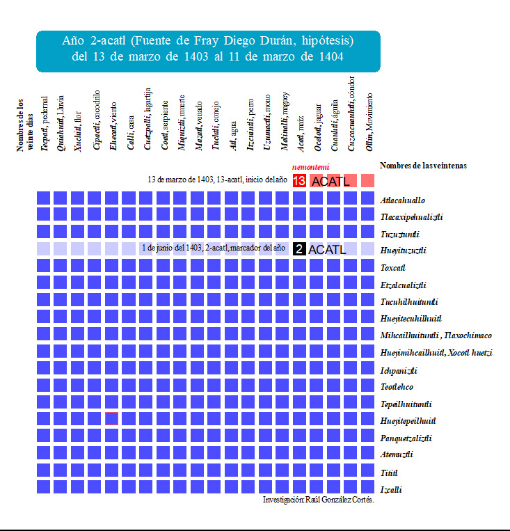 En este esquema se demuestra que el 13 de marzo de 1403 inició un fuego nuevo justo en el equinoccio de primavera. El 13 de marzo de 1403 correspondería al 21 de marzo gregoriano.